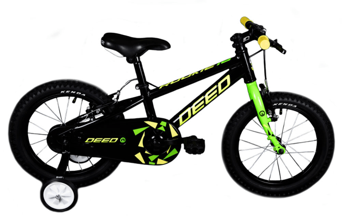 alu MTB kader, alu V-brakes en remgrepen, alu stuur, Ahead alu stuurpen, zwarte alu velgen, gesloten kettingkast, zijwielen, Thun cassettebracket, Selle Royal zadel, KMC Z410 ketting.